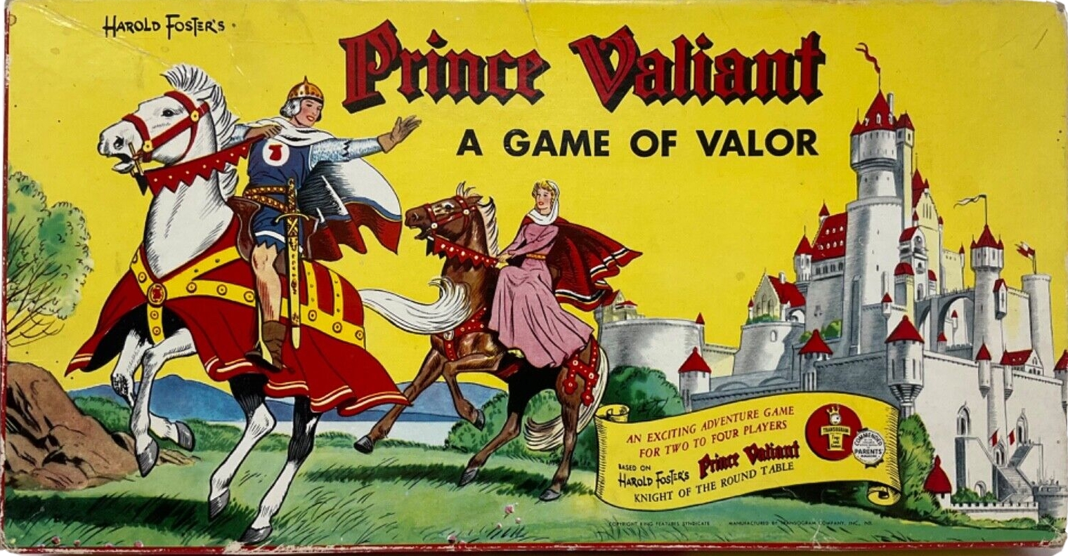 ZWECK DES SPIELS: Das Abenteuerspiel, das auf der Geschichte von Harold Foster „PRINZ EISENHERZ, RITTER DER TAFELRUNDE“ basiert, führt den Spieler durch die sieben ritterlichen Abenteuer von Prinz Eisenherz auf seiner Suche nach dem Rittertum. Durch das Abschließen eines Abenteuers erhält jeder Spieler Verdienstpunkte, die auf der Tatentabelle des Prinzen Eisenherz aufgeführt sind. Der Gewinner ist der erste Spieler, der seine sieben Abenteuer in der richtigen Reihenfolge beendet, das Burgtor betritt, den Burggraben umrundet, die Burg betritt und als Ritter an der Tafelrunde von König Artus Platz nimmt.