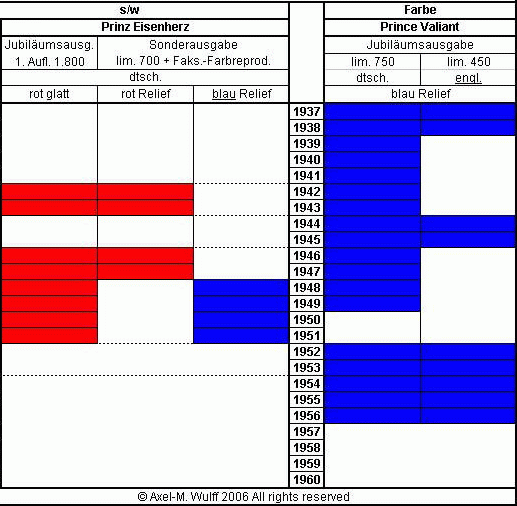 Dabei brachte Splitter zunächst die s/w-Ausgabe heraus. Als der Verlag die Vierfarb-Ausgabe in Angriff nahm, wurde als erstes 1994 der Jahrgang 1952 aufgelegt. Es folgten die Jahrgänge 1953 bis 1956. Danach entschied sich der Verlag, mit 1937 weiter zu machen. Der letzte Band war der Jahrgang 1949 (erschienen 1999). Deswegen sind die Jahrgänge 1950 und 1951 nur in s/w erschienen.