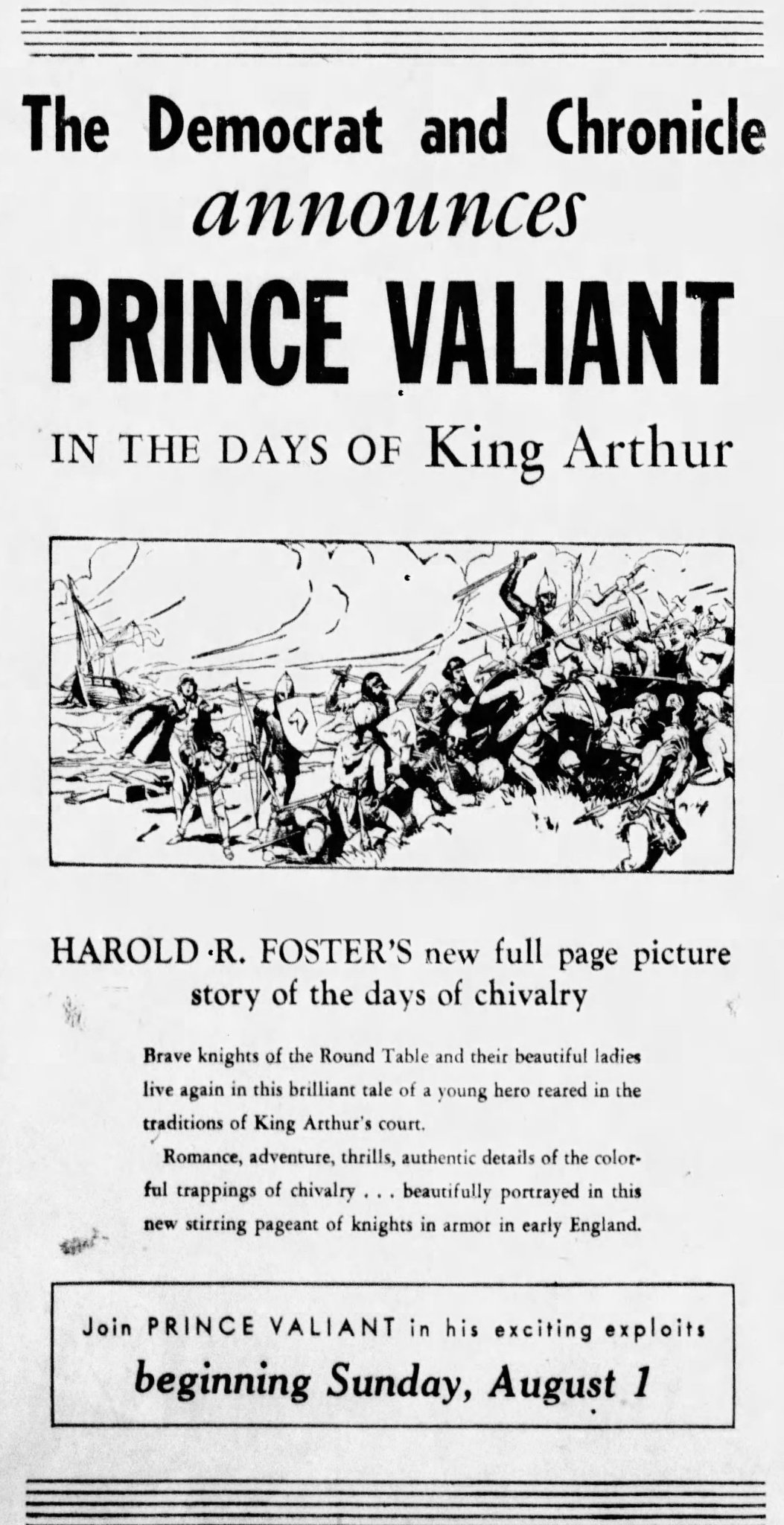 Die Tageszeitung »The Democrat and Chronicle« aus Rochester, New York, veröffentlichte bereits sehr früh die „full pages“ von Prince Valiant (PV). Diese hier gezeigte Anzeige datiert vom 29. Juli 1937 und kündet den Start von PV in der Comic-Rubrik der nächsten Sonntagsausgabe am 1. August 1937 an. Das gezeigte Bild ist das erste Panel von Sonntagsseite #2.