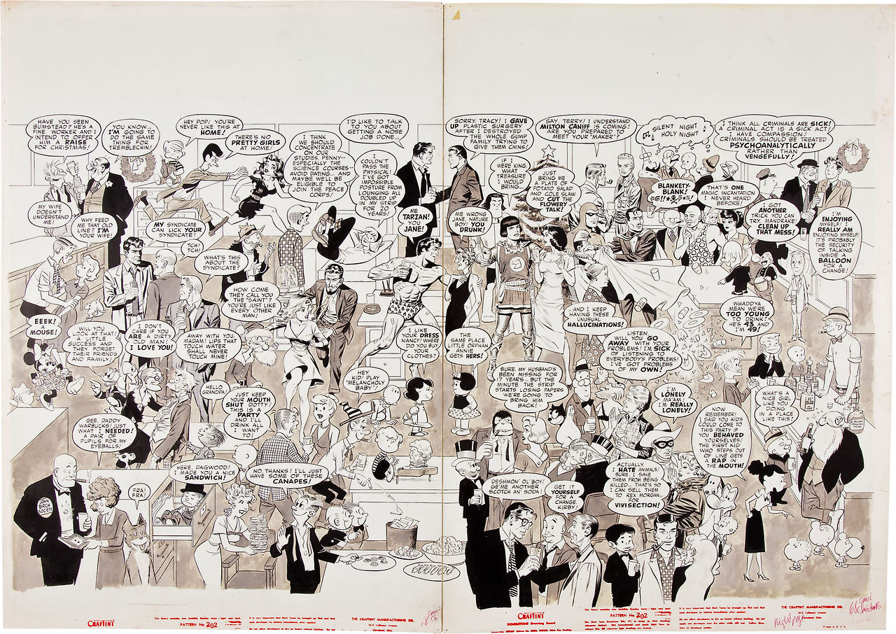 Quelle: “The Comic Strip Characters’ Christmas Party!” Original double-page spread by Wally Wood (art) and George Belkin (script) from Mad #68, published by EC Comics, January 1962. http://wallywood.tumblr.com/page/5