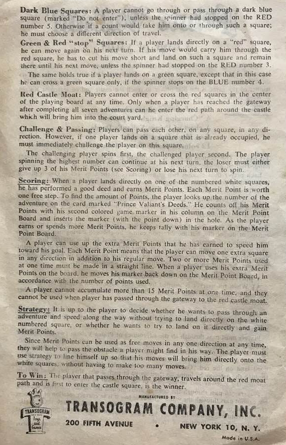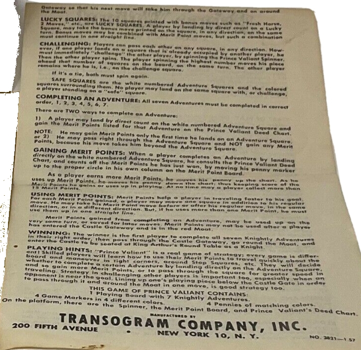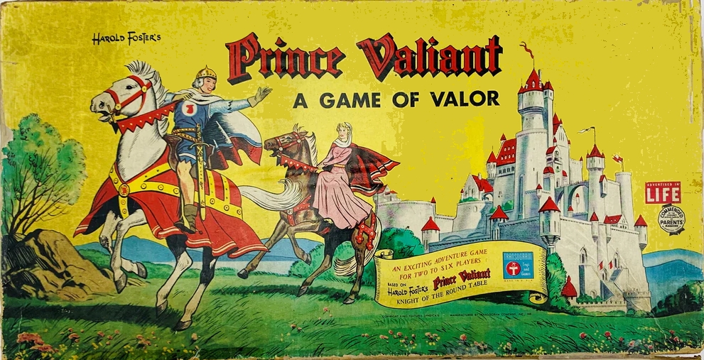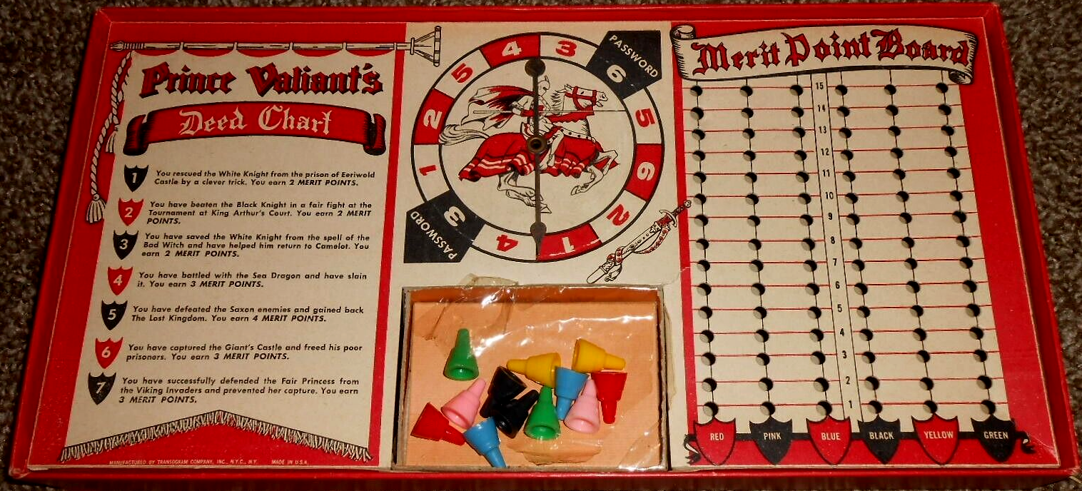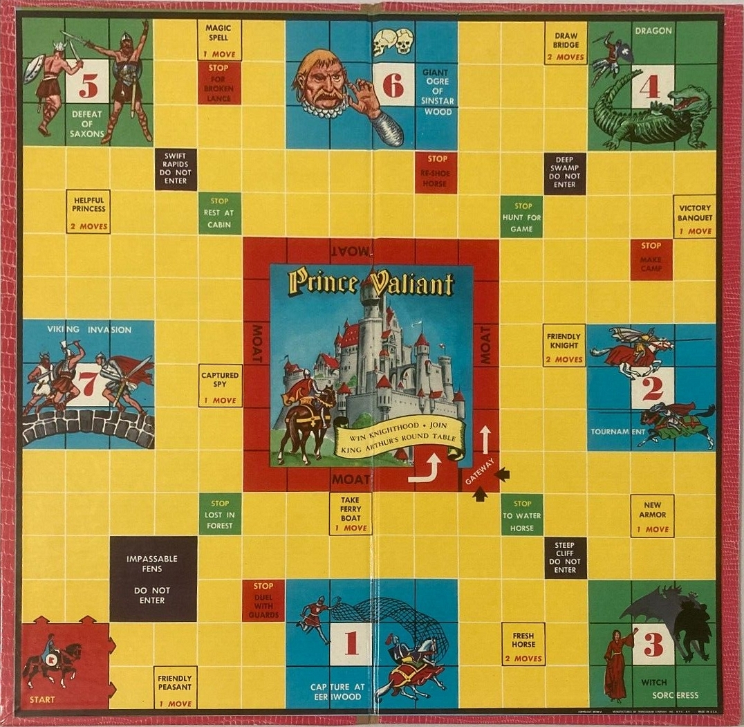ZWECK DES SPIELS: Das Abenteuerspiel, das auf der Geschichte von Harold Foster „PRINZ EISENHERZ, RITTER DER TAFELRUNDE“ basiert, führt den Spieler durch die sieben ritterlichen Abenteuer von Prinz Eisenherz auf seiner Suche nach dem Rittertum. Durch das Abschließen eines Abenteuers erhält jeder Spieler Verdienstpunkte, die auf der Tatentabelle des Prinzen Eisenherz aufgeführt sind. Der Gewinner ist der erste Spieler, der seine sieben Abenteuer in der richtigen Reihenfolge beendet, das Burgtor betritt, den Burggraben umrundet, die Burg betritt und als Ritter an der Tafelrunde von König Artus Platz nimmt.