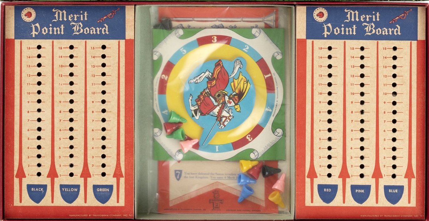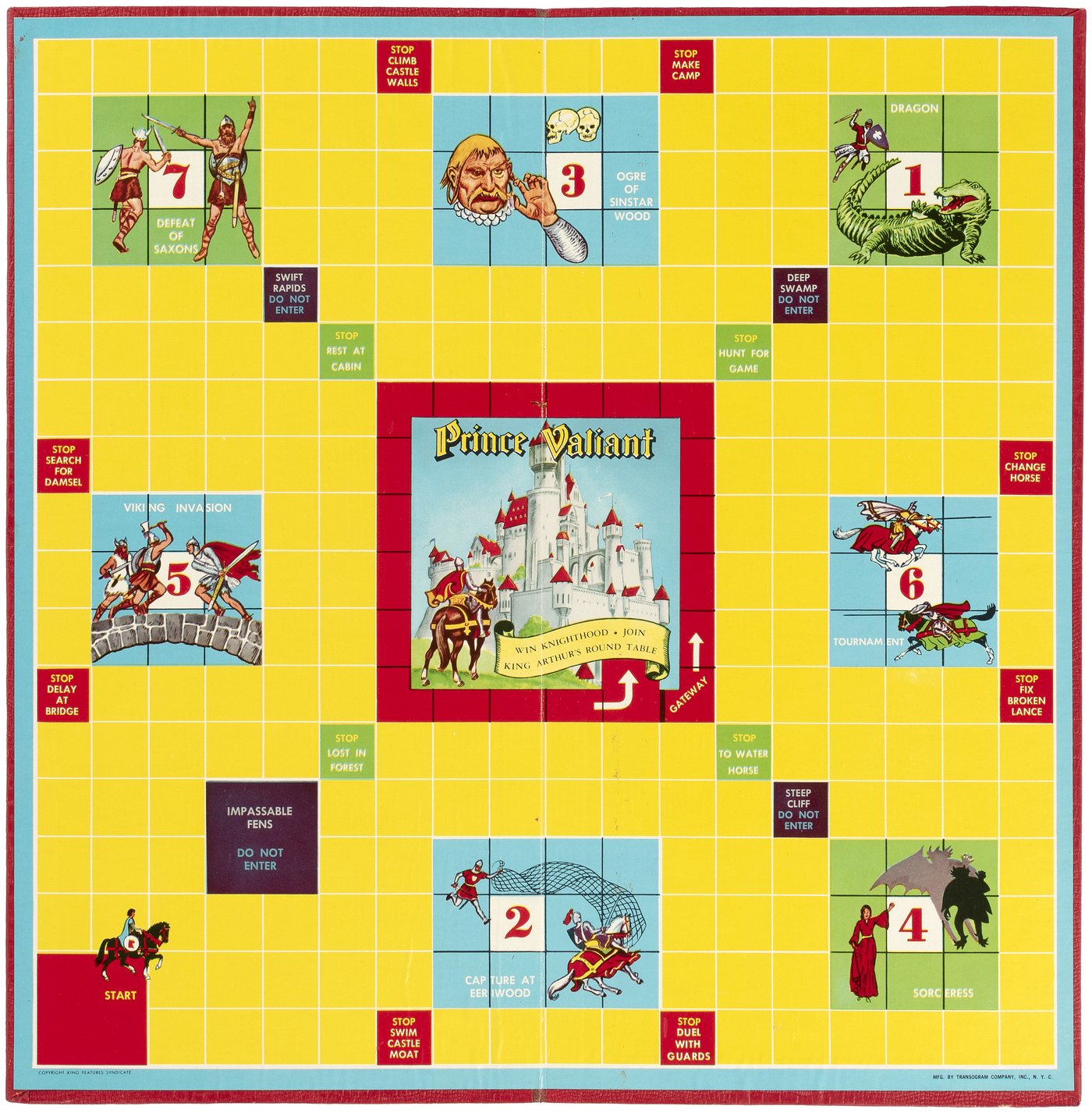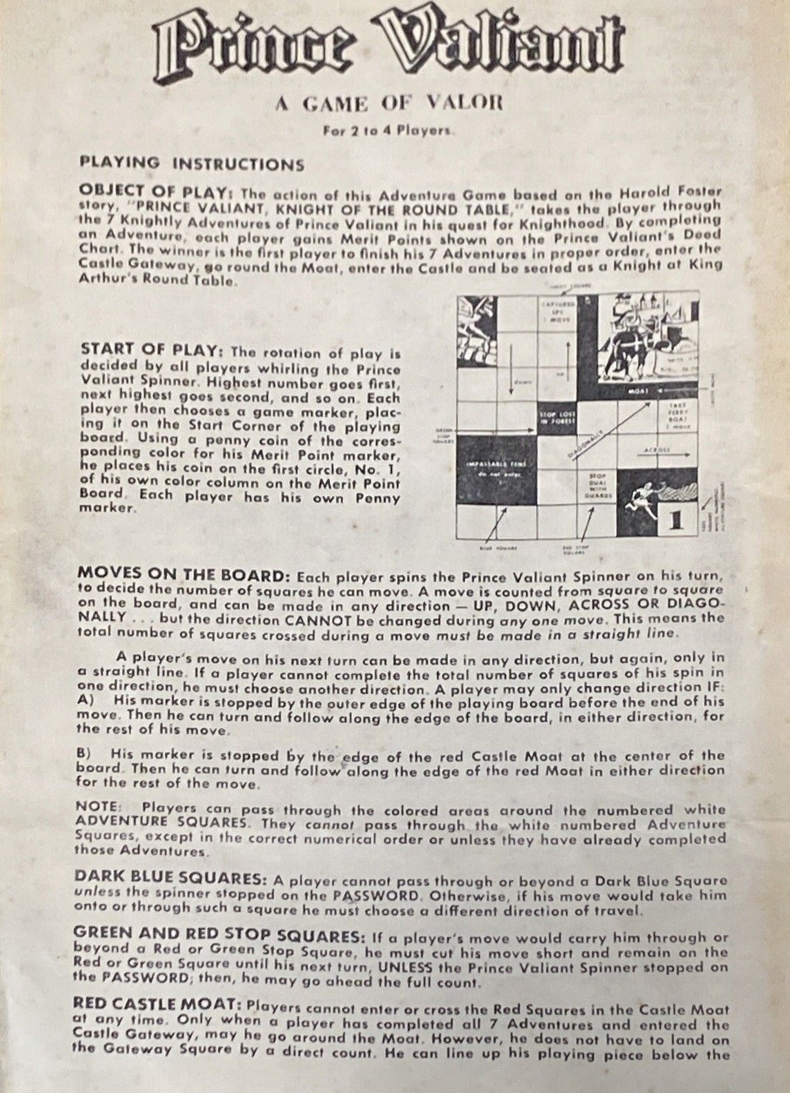 ZWECK DES SPIELS: Das Abenteuerspiel, das auf der Geschichte von Harold Foster „PRINZ EISENHERZ, RITTER DER TAFELRUNDE“ basiert, führt den Spieler durch die sieben ritterlichen Abenteuer von Prinz Eisenherz auf seiner Suche nach dem Rittertum. Durch das Abschließen eines Abenteuers erhält jeder Spieler Verdienstpunkte, die auf der Tatentabelle des Prinzen Eisenherz aufgeführt sind. Der Gewinner ist der erste Spieler, der seine sieben Abenteuer in der richtigen Reihenfolge beendet, das Burgtor betritt, den Burggraben umrundet, die Burg betritt und als Ritter an der Tafelrunde von König Artus Platz nimmt.