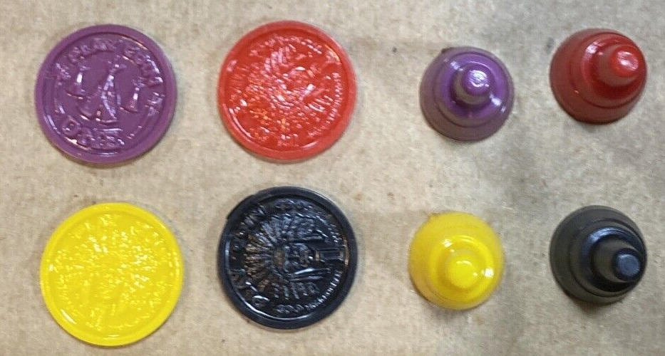 4 Spielfiguren in 4 verschiedenen Farben. 4 Münzen in passenden Farben.