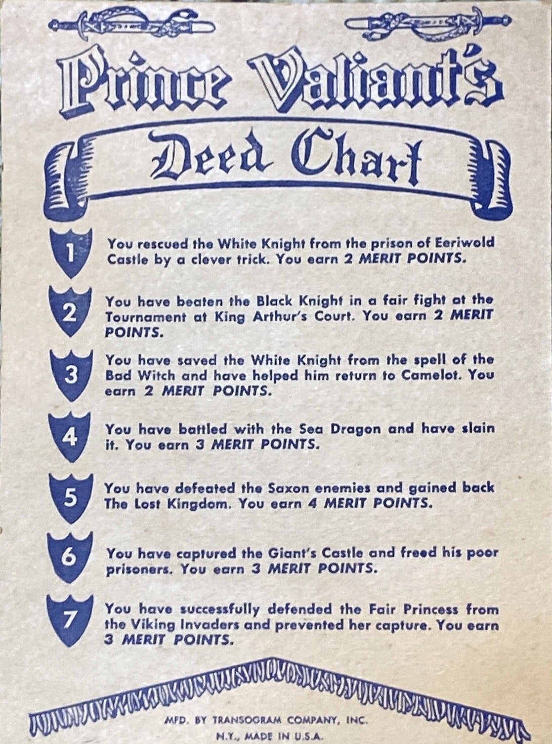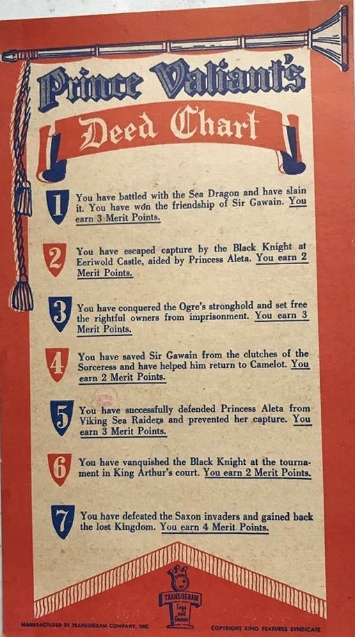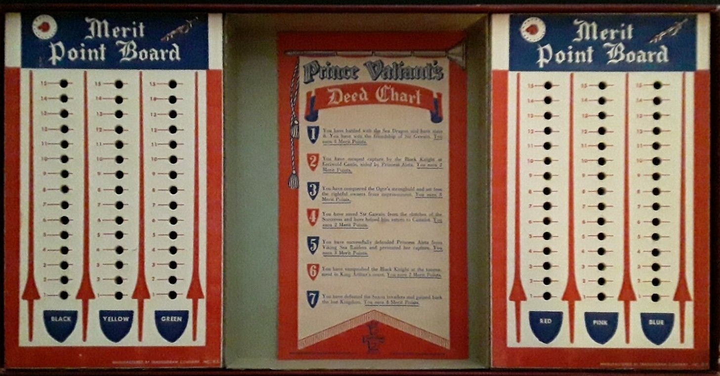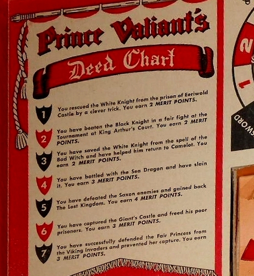 VERDIENSTPUNKTE ERHALTEN: Wenn ein Spieler ein Abenteuer durch einen direkten Zug auf einem weiß nummerierten Abenteuer-Quadrat abschließt, schaut er auf die „Prinz Eisenherz Verdienst-Tabelle“. Der Spieler rückt seine Verdienstmünze in seiner eigenen Spalte auf der Verdienst-Punkte-Anzeige-Tafel um die Anzahl der Verdienstpunkte vor, die er gerade gewonnen hat, indem er seine Münze bis zum entsprechenden Kreis bewegt.