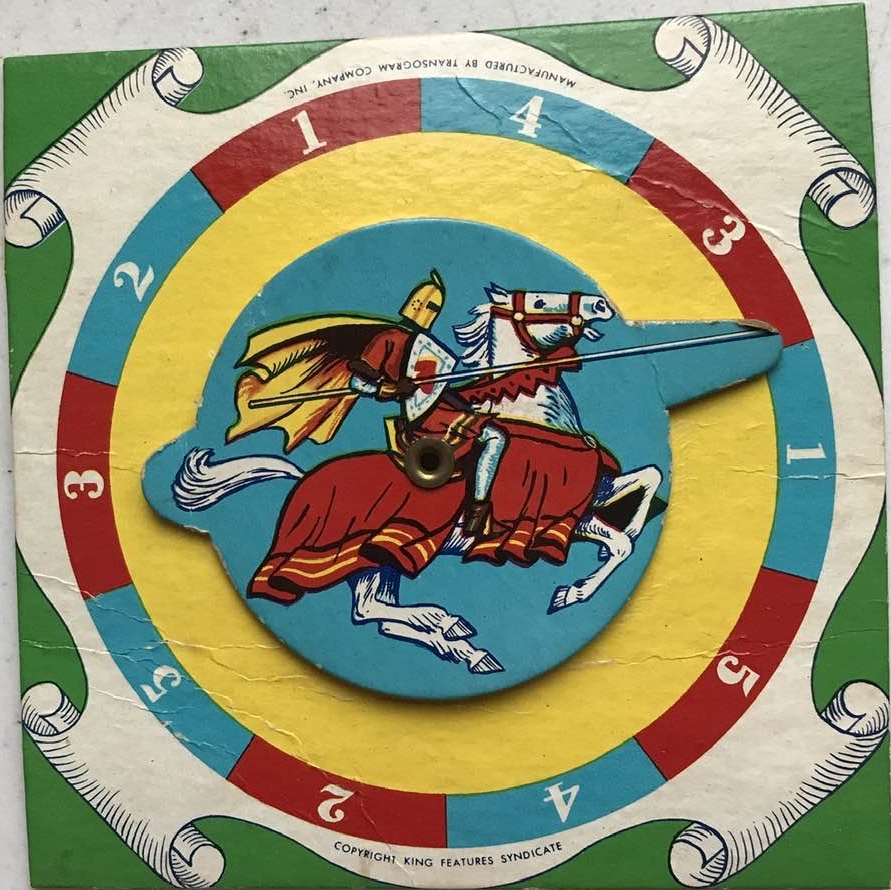 HERAUSFORDERUNG: Spieler können auf jedem Feld und in jede Richtung aneinander vorbeikommen. Wenn jedoch ein Spieler auf einem Feld landet, das bereits von einem anderen Spieler besetzt ist, muss er den anderen Spieler sofort „herausfordern“, indem er das Prinz Eisenherz Rad dreht. Dann dreht der andere Spieler. Der Spieler, der die höchste Zahl dreht, bewegt seine Figur im selben Zug um die Anzahl Felder auf dem Brett weiter. Der andere Spieler bleibt dort, wo er ist, also auf dem Herausforderungsfeld.