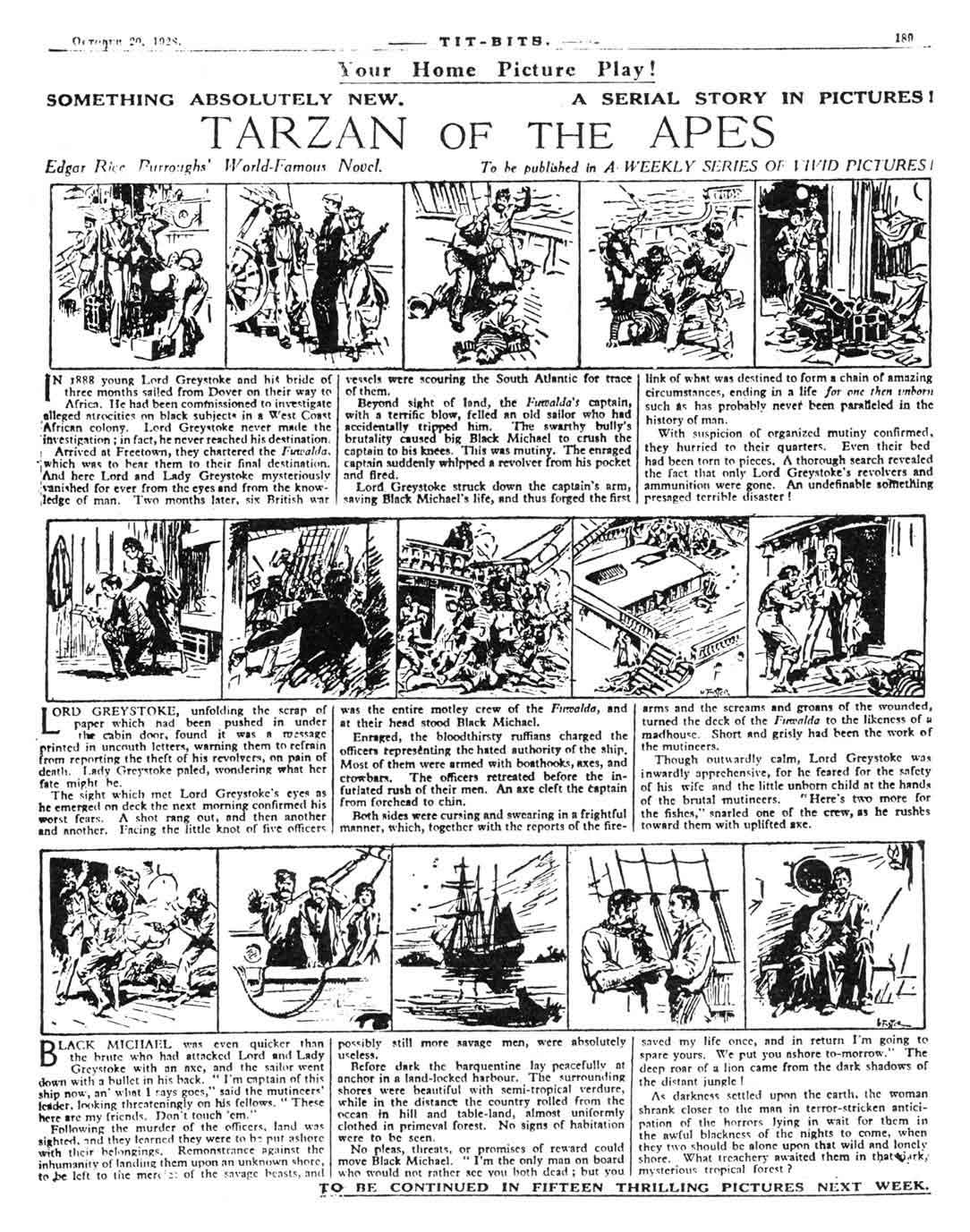 Tarzan in Tid-Bits/U.K.Über einen seiner Auftraggeber lernte er 1928 Joseph H. Neebe kennen, der von Edgar Rice Burroughs die Rechte für einen „Tarzan“-Strip erworben hatte. Neebe gewann Foster als Zeichner für sein Projekt. Am 20. Oktober 1928 erschien dann die erste Tarzan-Seite im britischen Magazin »Tit-Bits„, und am 7. Januar 1929 die erste „Tarzan of the Apes“-Bildgeschichte in dreizehn amerikanischen Tageszeitungen (zeitgleich mit dem von Dick Calkins gezeichneten „Buck Rogers“, so daß beide Serien als erste Abenteuerstrips der Comic-Geschichte gelten).